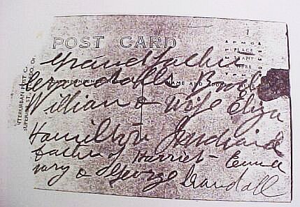 The "Grandfather Crandall" referred to is George Martin Crandall, born NY - somewhere - in 1816.On back of card is written:"Grandfather Crandall's brother William & wife Eliza - Hamilton, Indiana father of Harriet, Emma, Mary & George Crandall"